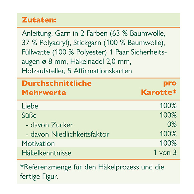 In diesem Set häkelst du die „Coole Karotte“ aus unserer Reihe der Emotional Support Veggies – perfekt als süßes Geschenk, Glücksbringer oder einfach für dich selbst! Verleihe der Karotte mit den exklusiven Spruch-Karten eine motivierende Botschaft oder eine persönliche Nachricht, die garantiert ein Lächeln auf jedes Gesicht zaubert. Also schnapp dir die Häkelnadel und leg los!
