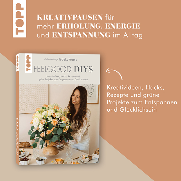 Catharina Junge aka @dekokrams nimmt dich in diesem Buch mit auf eine kreative Reise und zeigt dir, wie dir eine schöpferische Auszeit dabei helfen kann, Stress abzubauen, dich zu entspannen, zur Ruhe zu kommen und mehr Me-Time in deinen Alltag zu integrieren. In diesem einzigartigen DIY-Buch findest du eine Vielzahl von inspirierenden Ideen und Projekten, bei denen du dich kreativ austoben kannst und eine Auszeit vom Alltagsstress findest. Von köstlichen Rezepten über bezaubernde Deko-Inspirationen und schnelle DIYs mit verschiedenen Materialien hin zu Blumen- und Gartenprojekten oder selbstgemachten Zeit-Gutscheinen ist in diesem Buch für jeden Anlass das Passende dabei. Mit diesen Impulsen kannst du dich selbst verwöhnen, dein Zuhause in eine Ruheoase verwandeln oder deinen Liebsten eine Freude machen. Lass uns gemeinsam die kleinen Dinge im Leben feiern!
