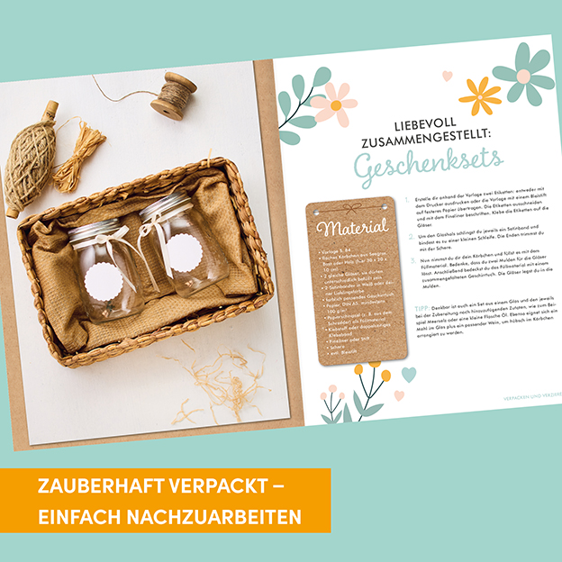 Damit die super praktischen Glas-Geschenke auch beim Verschenken echte Hingucker sind, gibt es zudem zahlreiche Ideen, Anleitungen und Vorlagen zum Verpacken in diesem Buch. Dank detaillierter Materiallisten und Schritt-für-Schritt-Anleitungen gelingt das Selbermachen garantiert!
