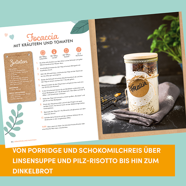 Keine Zeit zum Kochen oder Backen, aber Lust auf köstliche Leckereien? Dieses Buch ist die perfekte Lösung! Hier finden Sie zahlreiche kreative Rezeptideen für Koch- und Backmischungen im Glas, von Porridge und Schokomilchreis über Linsensuppe und Pilz-Risotto bis hin zum Dinkelbrot – einfach, schnell und wunderschön zum Verschenken. Für alle Mischungen benötigt man keine oder nur wenige weitere Zutaten, um daraus leckere Gerichte oder Backwaren herzustellen - genau das Richtige für alle, deren Tage immer zu wenige Stunden haben!