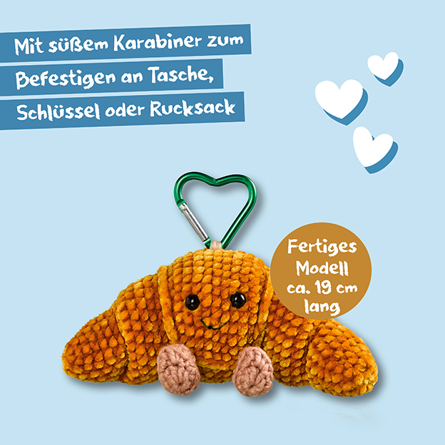 Mit diesem Häkelset kannst du ein superflauschiges Croissant selbst häkeln. Das Set enthält alles, was du brauchst: Chenillegarn in zwei Farben, Acrylgarn, Sicherheitsaugen, Füllwatte und eine Häkelnadel. Die beiligende Häkelanleitung führt dich Schritt für Schritt durch das Projekt. Dank des süßen Karabiners in Herzform kannst du deinen gehäkeltes Croissant direkt an Taschen, Schlüssel oder Rucksäcke hängen und hast es als kleines Accessoire immer dabei.