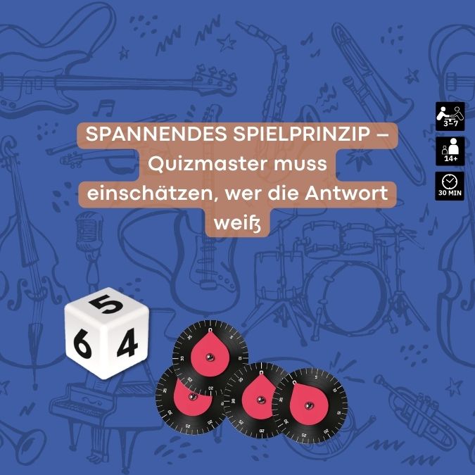 Eine Person zieht eine Fragenkarte und verteilt die Aufgaben an die Mitspielenden. Wer kennt sich mit den Beatles aus? Wer hört ständig Schlager? Wer erkennt den neuesten K-Pop-Song? Jede richtige Antwort bringt Punkte für den Quizmaster und denjenigen oder diejenige, die richtig geantwortet hat.