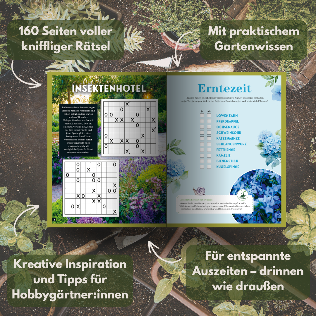 Neben jeder Menge Rätselspaß liefert dieses Buch praktisches Gartenwissen, kreative Inspiration und Tipps für Hobbygärtner:innen, um den eigenen grünen Rückzugsort noch schöner zu gestalten. Ob auf der Gartenbank, der Couch oder als Geschenk für Pflanzenliebhaber:innen – dieses Buch sorgt garantiert für Freude, Entspannung und kreative Stunden!