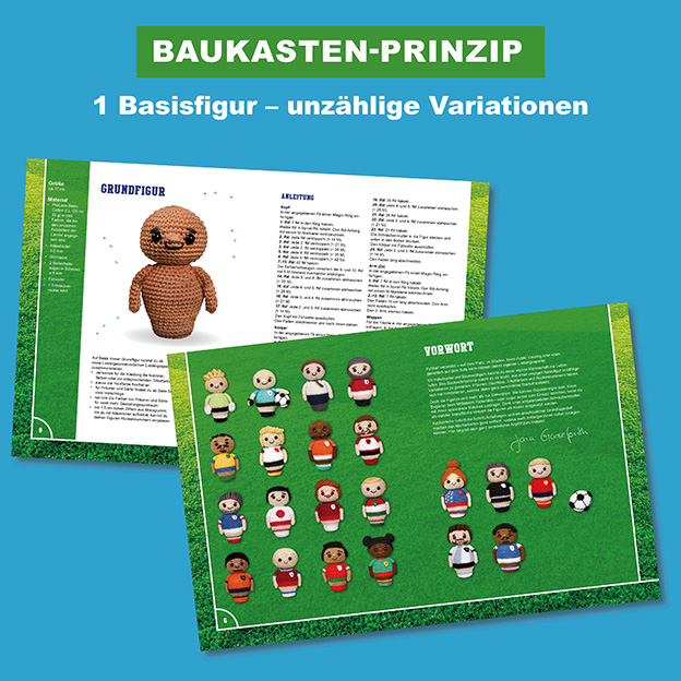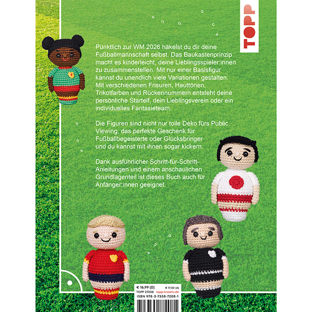 Pünktlich zur WM 2026 häkelst du dir deine Fußballmannschaft einfach selbst. Das Baukastenprinzip macht es dir kinderleicht, deine eigenen Lieblingsspieler:innen zu häkeln. Mit nur einer Basisfigur kannst du unzählige Variationen gestalten: verschiedene Frisuren, Hauttöne, Trikotfarben und sogar Rückennummern – so entsteht deine ganz persönliche Startelf, dein Lieblingsverein oder ein komplett eigenes Fantasieteam.