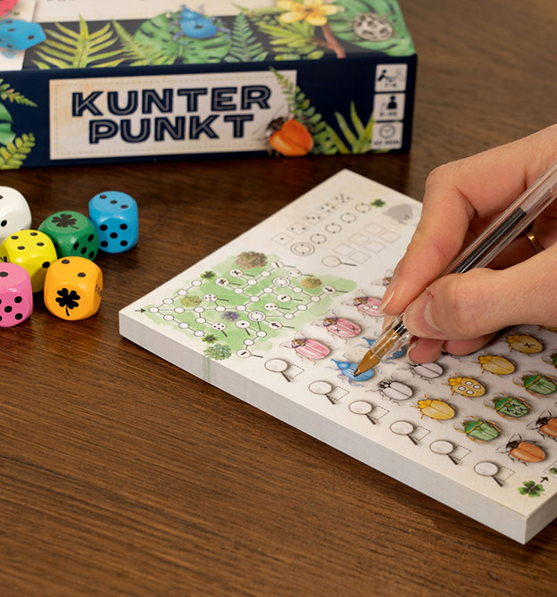 Noch mehr Käfer – noch längerer Würfelspaß mit unserem Ersatzblock für das Spiel „Kunterpunkt-das wuselige Würfenspiel“ mit 75 doppelseitig bedruckten Seiten.