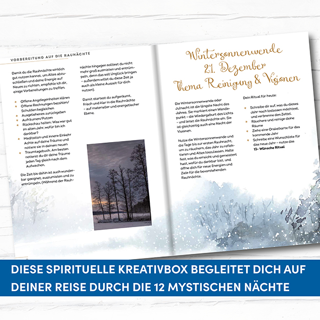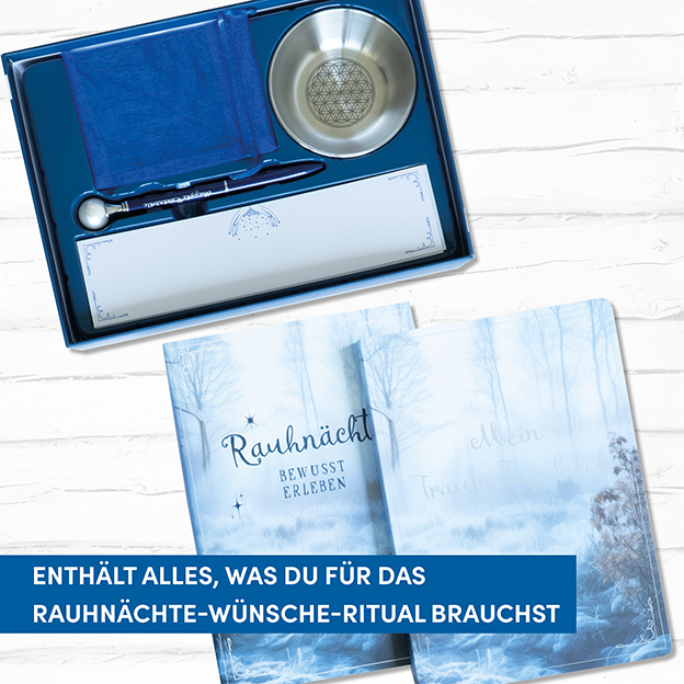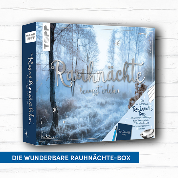 Bist du bereit, das alte Jahr hinter dir zu lassen und dich für die Magie der Rauhnächte zu öffnen? Diese spirituelle Kreativbox begleitet dich auf deiner Reise durch die 12 mystischen Nächte vom 25. Dezember bis zum 6. Januar. Mit dem 13-Wünsche-Ritual kannst du deine Herzenswünsche aufschreiben, sie anschließend in der, im Set enthaltenen, Schale verbrennen und so ihre Erfüllung manifestieren. Gleichzeitig bietet dir das Traumtagebuch Raum, um deine Gedanken, Träume und Erlebnisse in dieser besonderen Zeit festzuhalten. Tauche ein in die Magie der Rauhnächte und gestalte dein persönliches Ritual zum Jahresende!