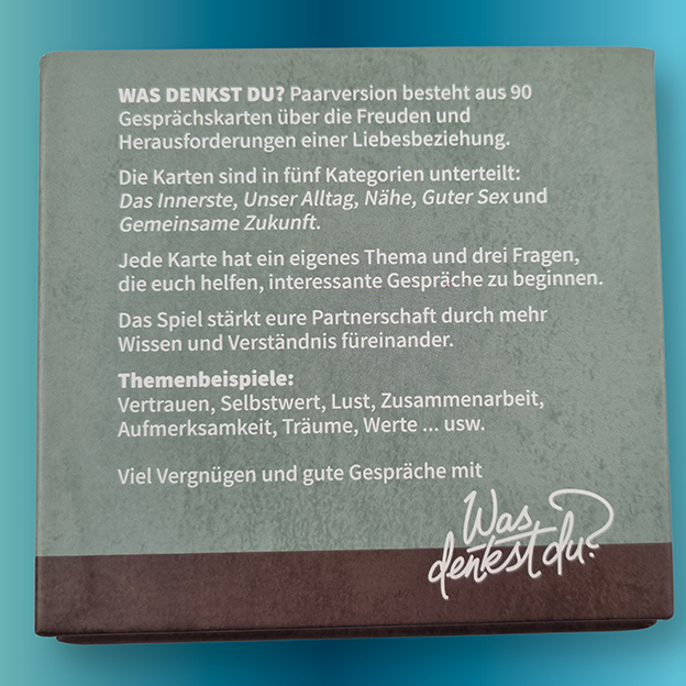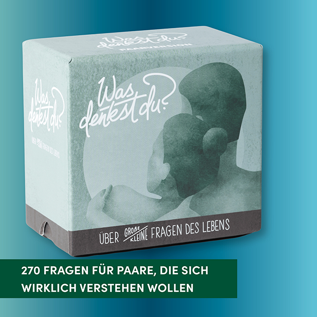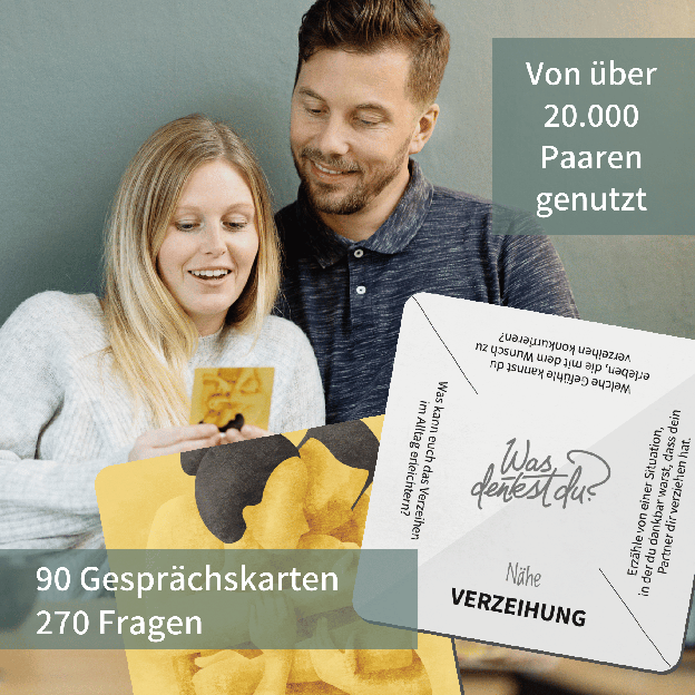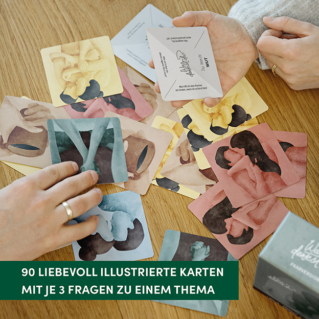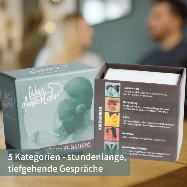 Jede Karte stellt euch drei Fragen zu einem bestimmten Thema, die euch dazu einladen, nicht nur eure Gedanken, sondern auch eure Gefühle füreinander auf eine völlig neue Weise zu teilen. Wie gut kennt ihr euch wirklich? Und wie oft lasst ihr eure Träume und Sorgen unbeachtet? Die Gesprächskarten bieten euch einen strukturierten, aber gleichzeitig spielerischen Rahmen, um miteinander in den Dialog zu treten und euch auch mal über Themen auszutauschen, die sonst vielleicht zu kurz kommen. Die enthaltene Broschüre „7 gute Tipps für eine bessere Kommunikation in der Beziehung“ gibt euch zusätzlich wertvolle Impulse, wie ihr eure Gespräche noch intensiver und ehrlicher führen könnt.