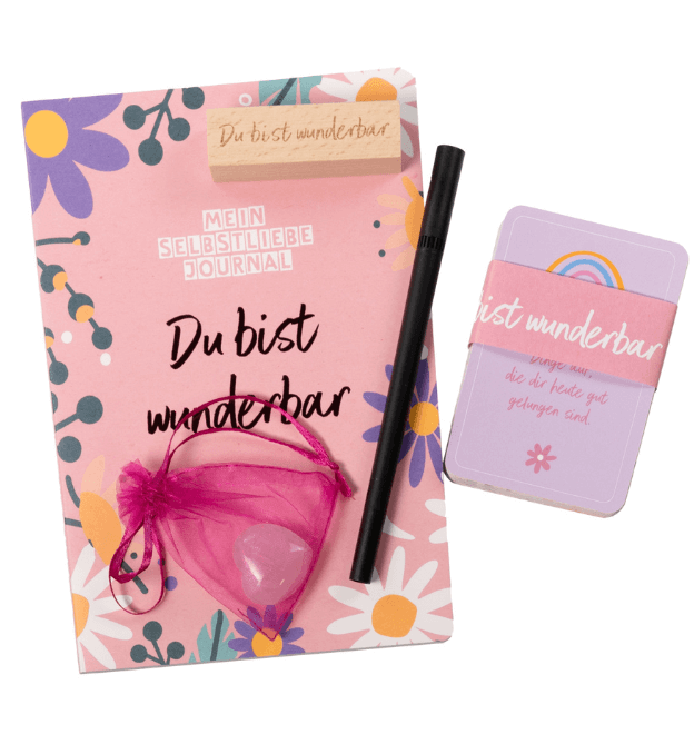 Löse dich von Selbstzweifeln und lerne dich selbst wertzuschätzen und mehr zu lieben. In dieser schön gestalteten Box findest du 50 Selbstliebe-Karten mit inspirierenden Übungen, Impulsen und Sprüchen, die dir dabei helfen, dein Selbstwertgefühl zu steigern und Selbstliebe aufzubauen. Die Selbstliebe-Karten lassen sich gut in den Alltag integrieren. Der Rosenquarz in Herzform ist dein ständiger Begleiter und soll dich immer daran erinnern, wie liebenswert du bist. In dem beigefügten Notizbuch kannst du deine Gedanken, Sorgen und Inspirationen festhalten. Auch deinen Liebsten kannst du mit der „Zeit für Dich”- Box eine große Freude bereiten.