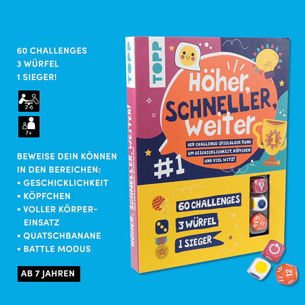Mit diesem Buch kannst du 60 Challenges mit 2-6 Spieler:innen spielen. Bedenke jedoch, es kann nur einen Sieger geben! Welche der 60 Challenges für wie viele Punkte absolviert werden muss, entscheiden die 3 beiliegenden Würfel.