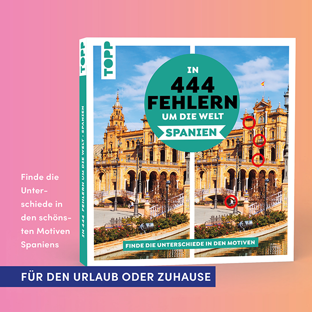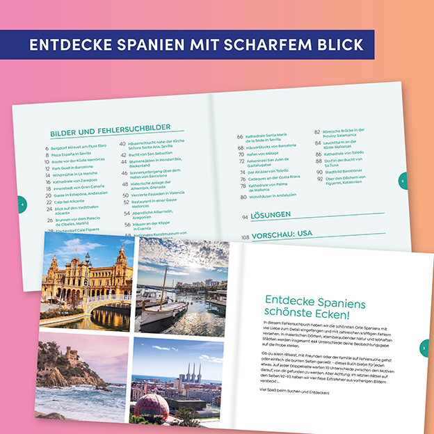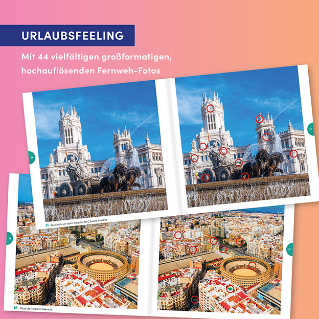 Lass dich von 44 traumhaften Bildern auf die Balearen, die Kanaren, nach Andalusien und Madrid entführen. Löse knifflige Suchrätsel und finde alle Bildfehler auf deiner Reise durch den sonnigen Süden. Erlebe Fernweh auf 112 Seiten und erkunde die schönsten Gegenden Spaniens!