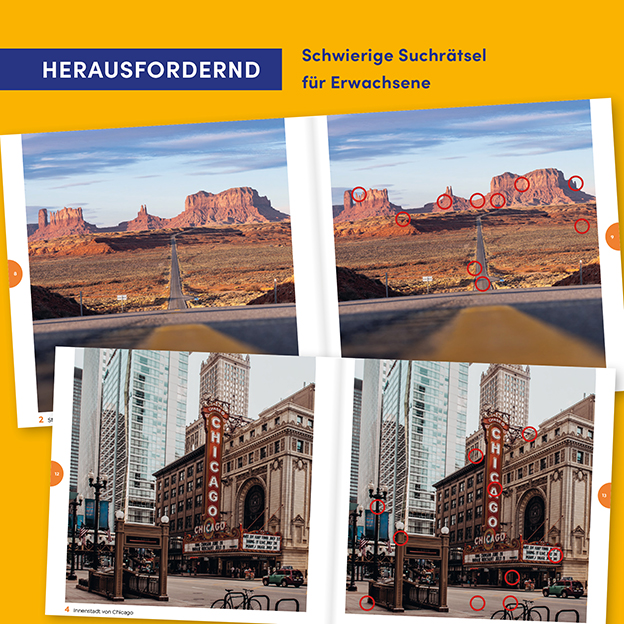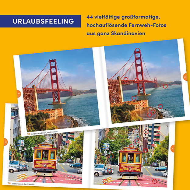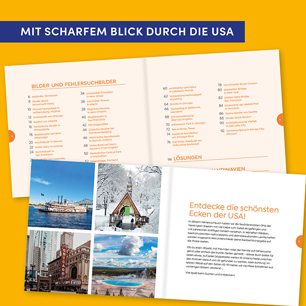 Lass dich von 44 abwechslungsreichen Bildern nach New York, Kalifornien und New Orleans entführen. Löse knifflige Suchrätsel und finde alle Bildfehler auf deiner Reise quer durch die USA. Erlebe Fernweh auf 112 Seiten und erkunde die verschiedensten Winkel der Vereinigten Staaten!