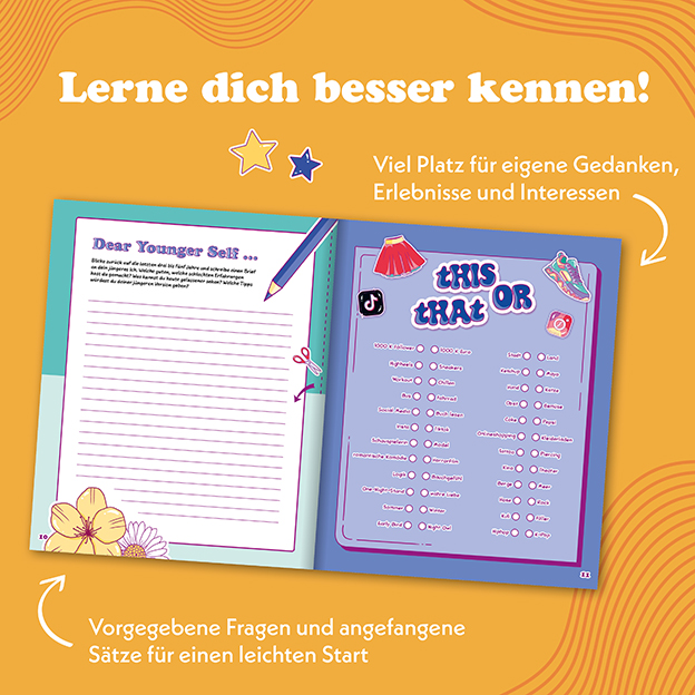 Lerne dich jetzt noch besser kennen. Dieses Eintragebuch bietet den perfekten Start dafür. Durch viel Platz zum Eintragen, vielen inspirierenden Fragen, aber auch vielen Infos rund um die Themen die dich in deiner girly Era interssieren. Erfahre alles Wichtige zu den Themen Selbstbewusstsein, Mädchen-Sein, Empowerment, Bodypositivity, Pubertät und Menstruation, Finanzen und Soziale Medien.