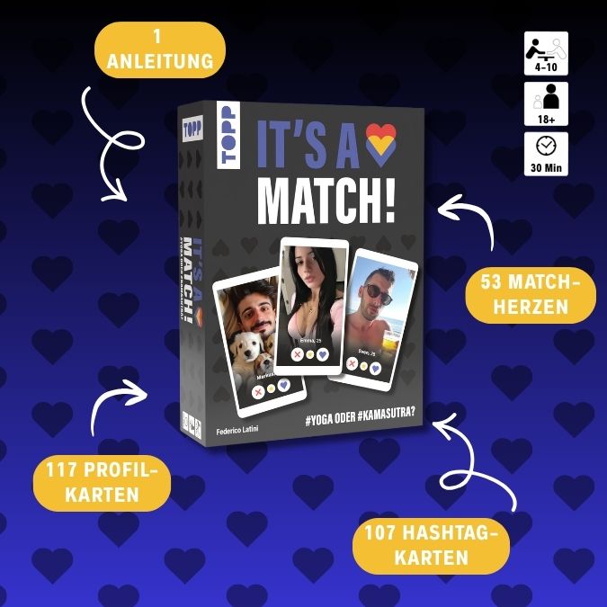 Erlebe das ultimative Partyspiel, das die Welt der Dating-Apps direkt zu dir nach Hause bringt. Wer hat, was du suchst? Deine beiden Matchmaker bestimmen deine #hashtags – du entscheidest, welches Profilbild dein Herz erobert. Volle Übereinstimmung oder swipe left? Das perfekte Date gewinnt!