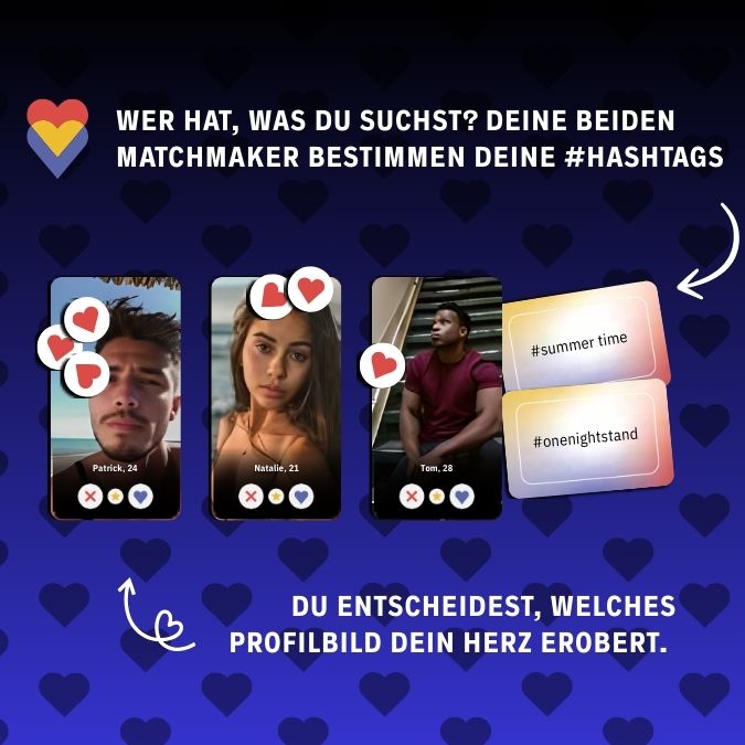 Die Personen links und rechts von dir übernehmen die Rolle deiner Matchmaker und wählen aus Hashtags wie #milfhunter, #summertime, #dirtyminded oder #abenteuer aus, was auf dein zukünftiges Herzblatt zutreffen soll. Alle Spielenden schlagen eine von ihren 5 Profilkarten vor. Du wählst daraus die drei passendsten Favoriten, um möglichst viele Match-Punkte zu bekommen.