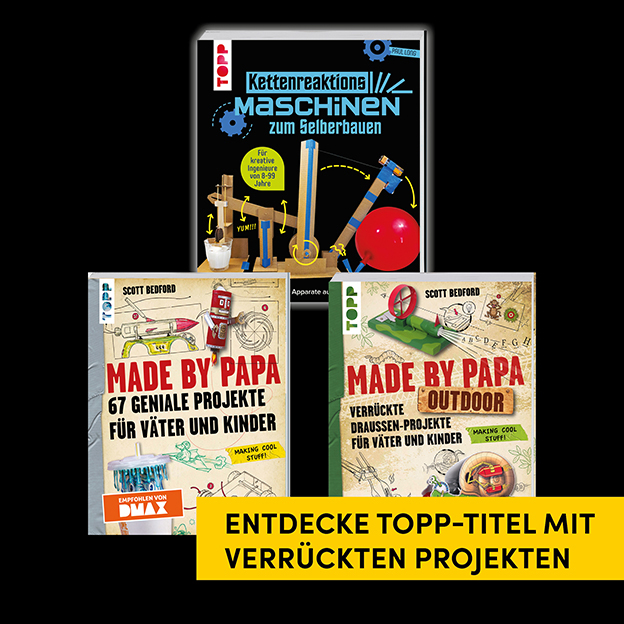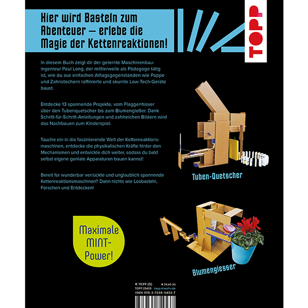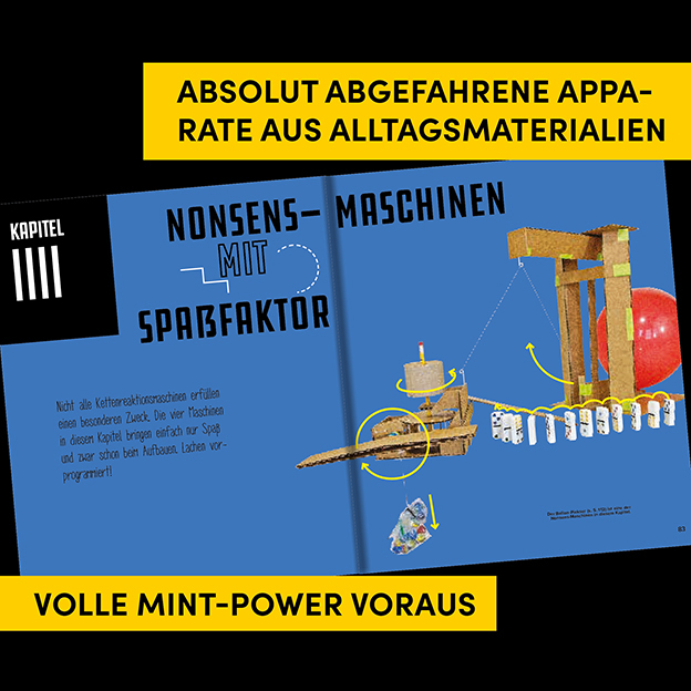 Entdecke die spannende Welt der Physik auf kreative Art! „Kettenreaktions-Maschinen zum Selberbauen“ ist das ideale Buch für neugierige Tüftler:innen, junge Erfinder:innen und alle, die Technik mit Spaß erleben möchten. Mit einfachen Materialien wie Pappe, Zahnstochern, Gummibändern und Klebeband entstehen 13 verrückte, fantastische Kettenreaktionsmaschinen, die Kinder und Erwachsene gleichermaßen begeistern.