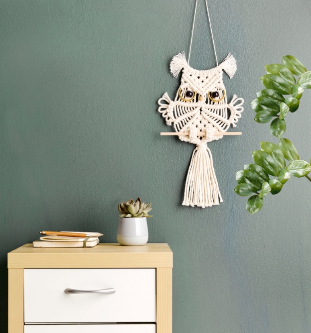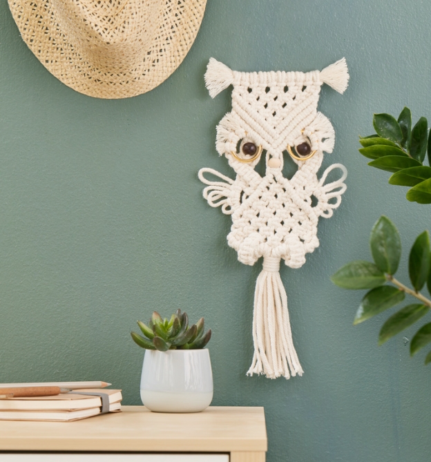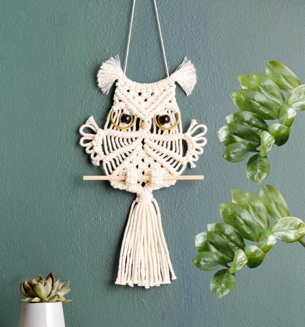 Mit diesem DIY-Set entsteht schnell und einfach eine süße Eule. Die benötigten Materialen sind alle enthalten und dank der beiliegenden Anleitung mit Schritt-für-Schritt-Fotos ist das Set auch für Anfänger geeignet. Also ran an die Fäden und losknüpfen!