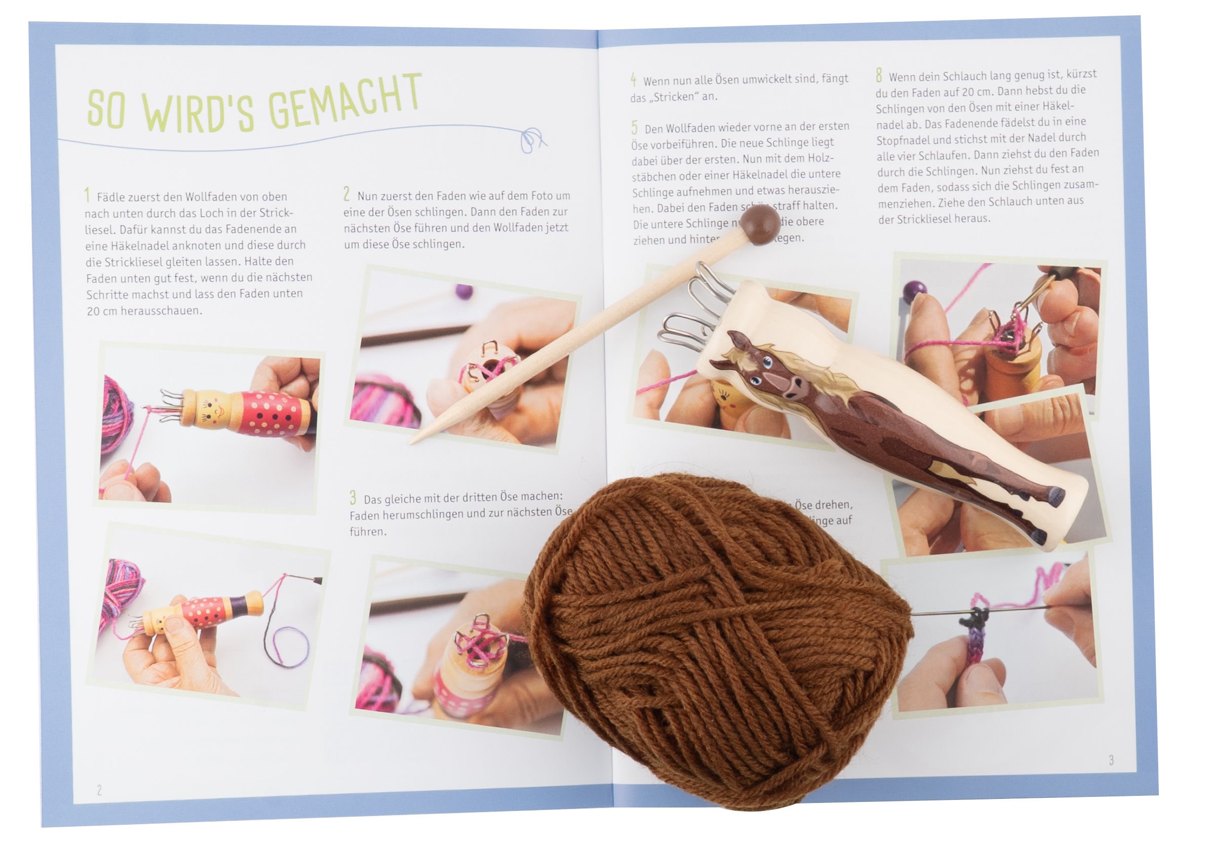 Buch (32 Seiten, DIN A5, Softcover) mit Strickliesel und Garn (100% Polyacryl).