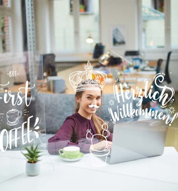 Sie sind überall: Plexiglaswände! Mach sie zu deiner Plattform, bewaffne dich mit Kreidemarker und Vorlagenmappe und leg los: Nette Sprüche für die kaffeedurstigen Kollegen, ein hübsches Krönchen auf Haupthöhe, oder doch lieber ein paar Hasenohren?