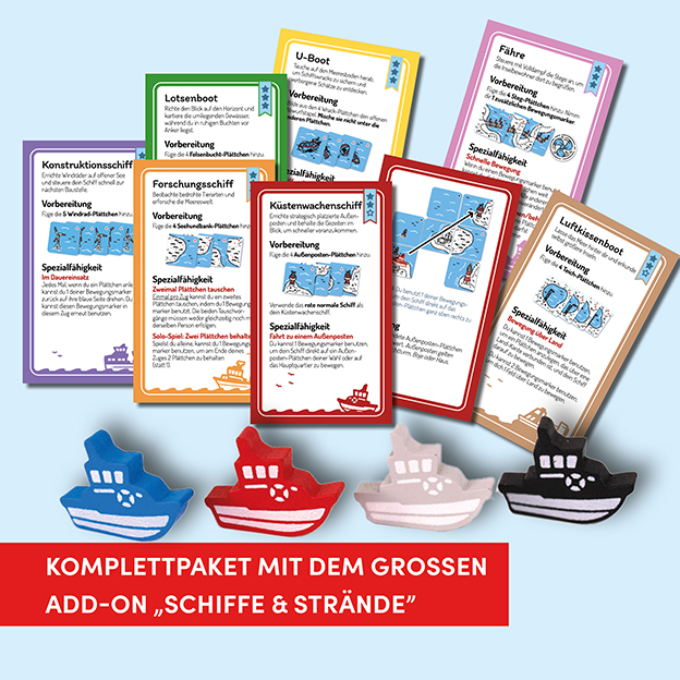 Für echte Seebären bietet die enthaltene Erweiterung „Schiffe & Strände” zusätzliche Spielmöglichkeiten: Setzt Spezialschiffe wie das Lotsenboot, Forschungsschiff oder U-Boot ein, um neue Arten von Plättchen zu erkunden und noch mehr Punkte zu sammeln! Also, klarmachen zum Anlegen!