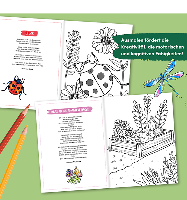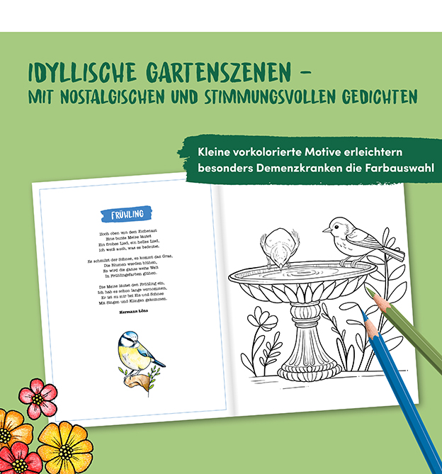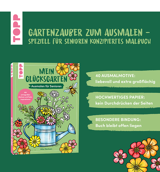 Ausmalen fördert nicht nur die Kreativität, sondern auch motorische und kognitive Fähigkeiten. Das macht es nicht nur zum idealen Zeitvertreib für Kinder, sondern auch ganz besonders für Senioren. Diese 40 liebevoll gestalteten Ausmalbilder lassen sich dank extragroßer Flächen besonders leicht ausmalen. Bei den Motiven dreht sich alles um den perfekten Garten: von der heimischen Pflanzenwelt über lauschige Sitzplätze bis hin zu den unterschiedlichen niedlichen Tieren, die einem dort begegnen mögen. Die dazu passenden nostalgischen Gedichte wecken Erinnerungen und kleine vorkolorierte Motive können besonders Demenzkranken die Farbauswahl erleichtern.
