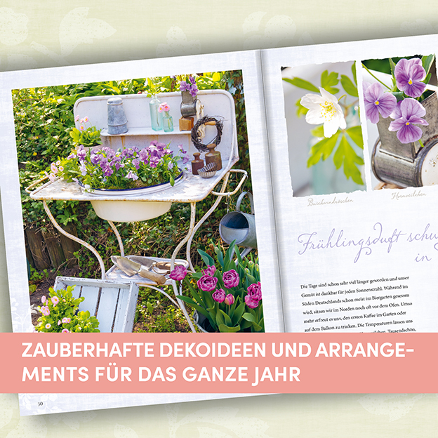 Blumen & Nostalgie für jede Jahreszeit – Romantische Garten-Dekorationen und Blütenarrangements im Landgarten
