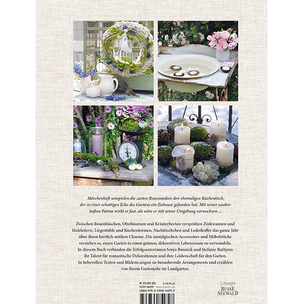 Märchenhafte Rosenranken schmücken einen ehemaligen Küchentisch in einer schattigen Gartenecke – mit zauberhafter Patina, die harmonisch mit der Umgebung verschmilzt. Die Bestseller-Autorinnen Sonja Bannick und Stefanie Rathjens verbinden in diesem Buch romantische Dekorationen mit Gartenliebe. In liebevollen Texten und inspirierenden Bildern zeigen sie bezaubernde Arrangements und erzählen von ihrem Gartenjahr im Landgarten.