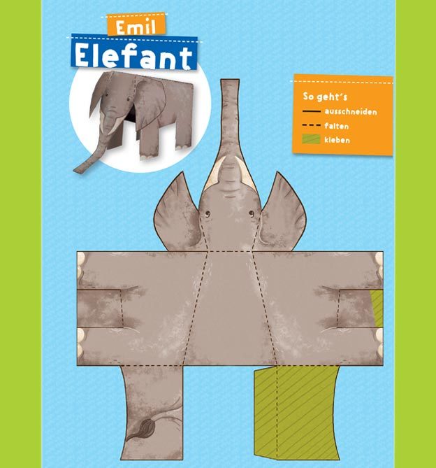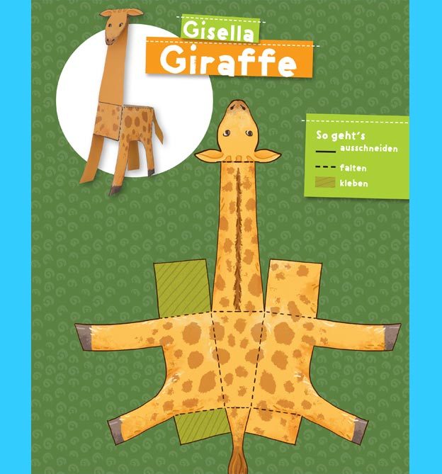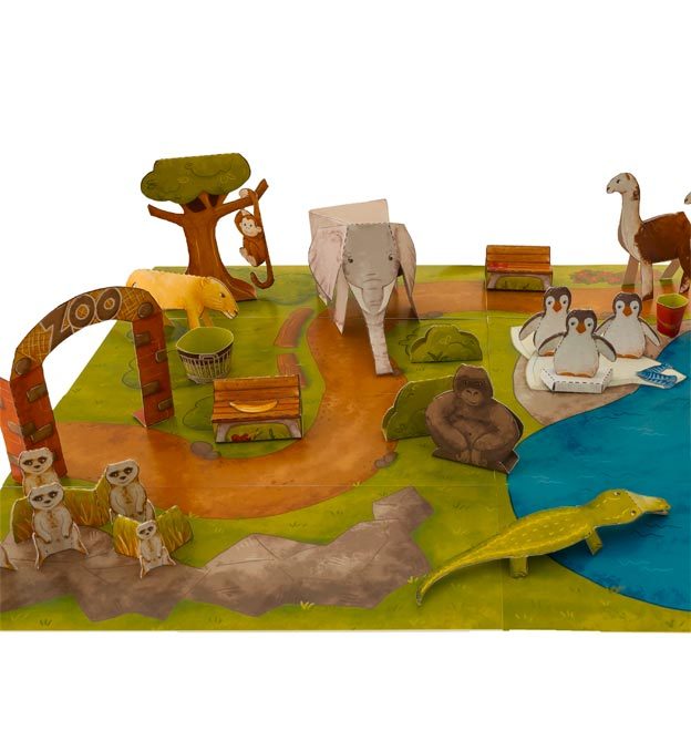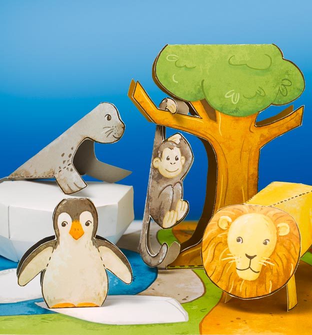 Alle Modelle, wie Kamel, Krokodil, Pinguin, Eisbär, Affe, Löwe, Nilpferd, Zebra, Elefant, Lama, Tiger, Bäume, Eisscholle, Zoo-Dekorationen, müssen ausgeschnitten und gefaltet werden.