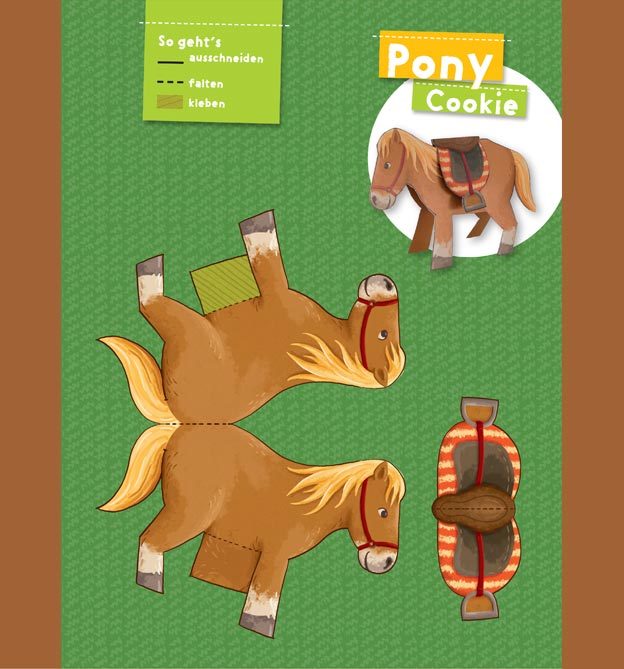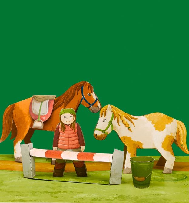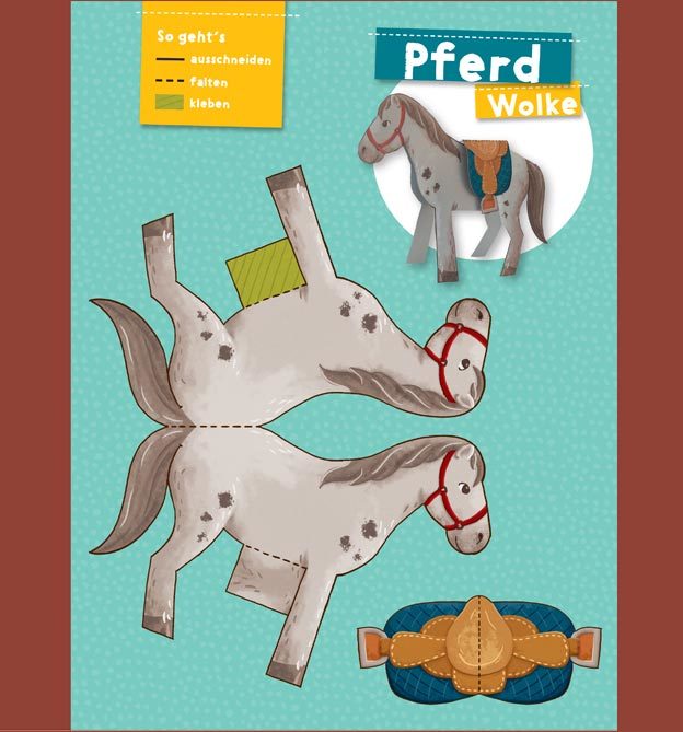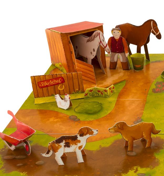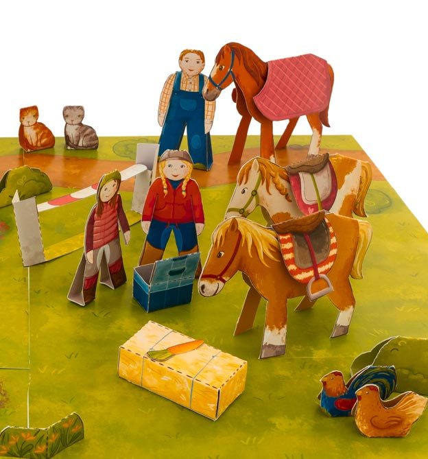 Alle Modelle, wie Pferde, Haustiere, Menschen und Dekorationen, müssen ausgeschnitten und gefaltet werden.