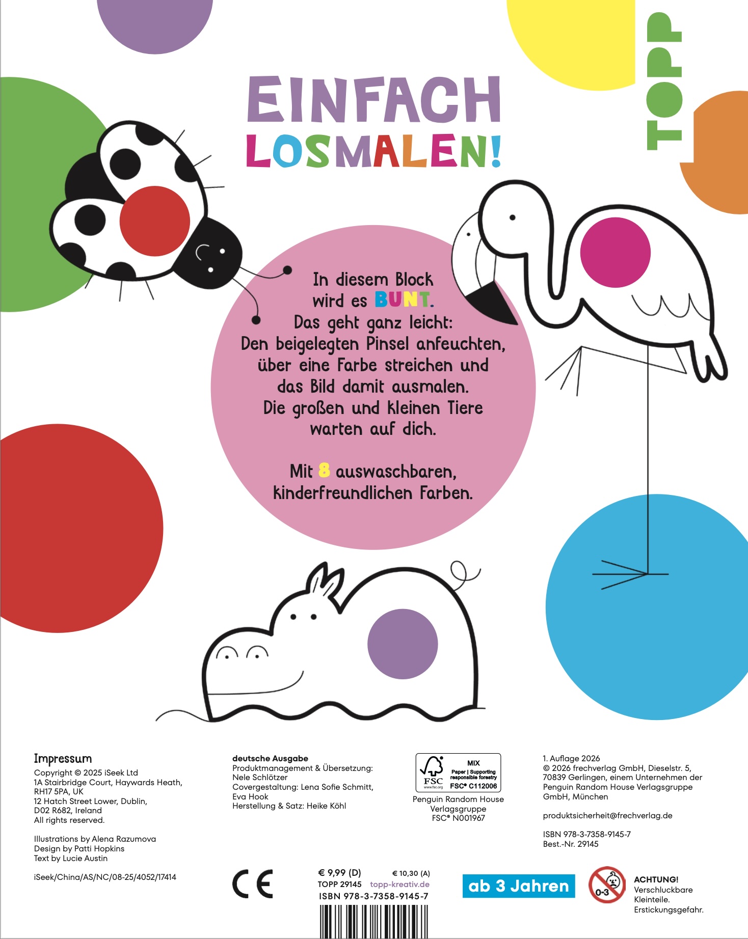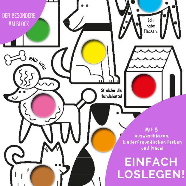 Dieser besondere Malblock kombiniert Ausmalspaß mit allem, was man zum Malen braucht! Im Block sind 8 Farbtabletten befestigt, die durch runde Ausstanzungen auf jeder Seite zu sehen sind. Mit dem beiliegenden Pinsel und etwas Wasser kann es sofort losgehen: einfach über eine Farbe streichen und die liebevoll gestalteten Tier- und Naturmotive bunt ausmalen. Perfekt, um spielerisch Farben zu lernen und ganz nebenbei die Feinmotorik zu fördern!