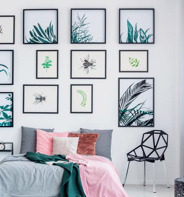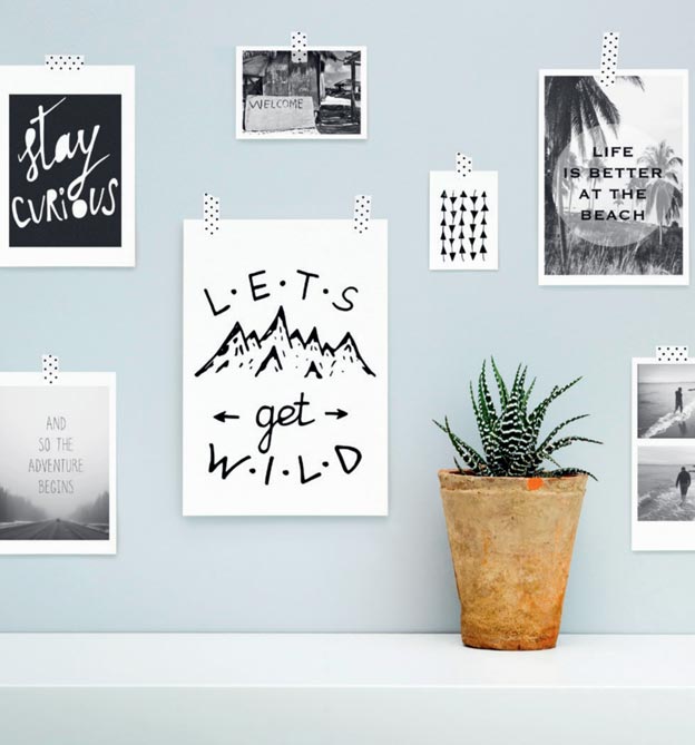 Für eine Gallery Wall braucht man keine echten Kunstwerke: private Bilder, schöne Poster, günstige Kunstdrucke, aber auch Souvenirs wie bunte Teller, Hüte oder sonstige Fundstücke lassen sich großartig in Szene setzen. Ob ganz schlicht und edel in Schwarz-Weiß, verspielt in Kunterbunt oder stilvoll in einer Farbwelt. Ob mit nur einem Bild, zwei Bildern, dreien oder gleich einer ganzen Horde. Ob entlang der Treppe, über dem Sofa, in der Küche oder auf der Kommode im Büro.