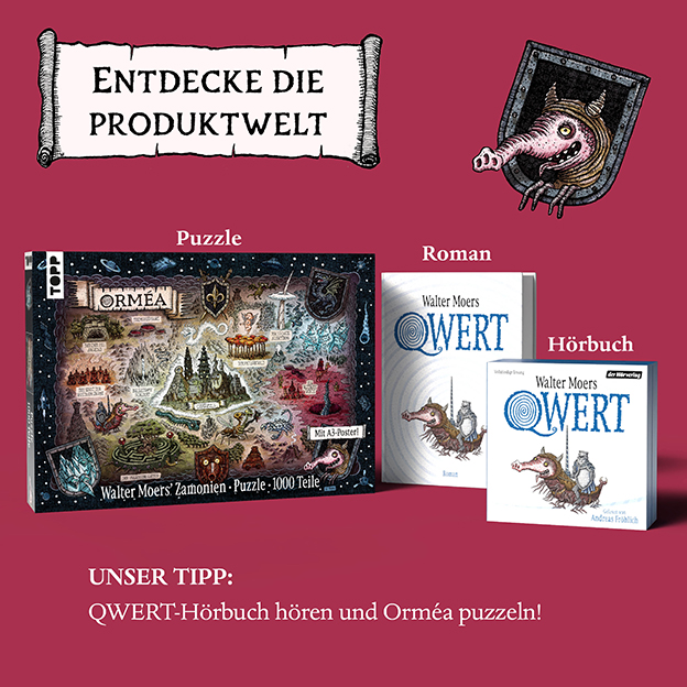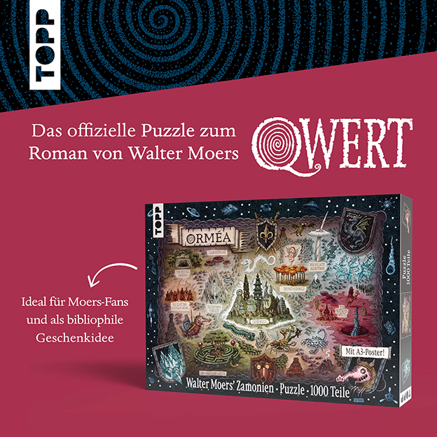 Puzzle die originale Landkarte aus Walter Moers’ aktuellem Roman QWERT, mit vielen ikonischen Figuren und Orten aus dem fantastischen Moers-Universum.