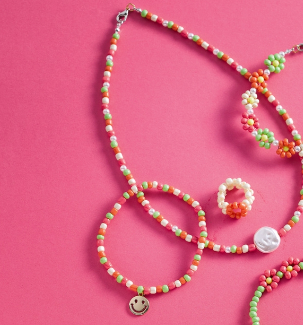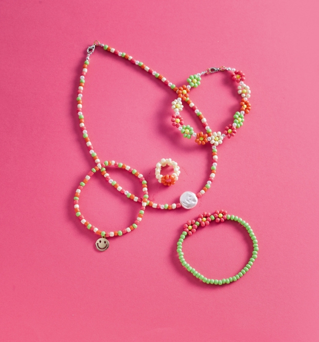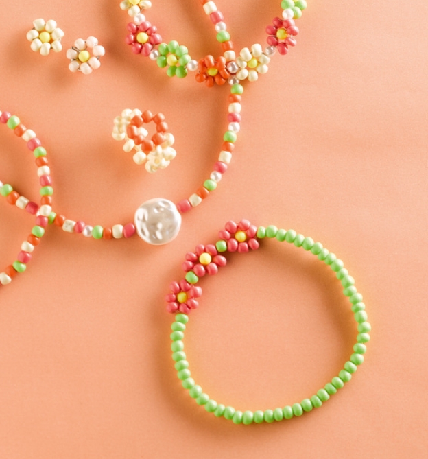Süßen Perlenschmuck ganz einfach selbst machen! Mit diesem Set kannst du ohne Vorwissen sofort losfädeln und deinen eigenen Schmuck designen. Die süßen Blümchen werden das Highlight bei deinem nächsten Outfit. Also ran an die Perlen und los!