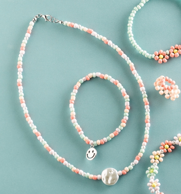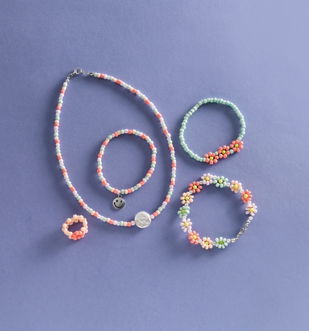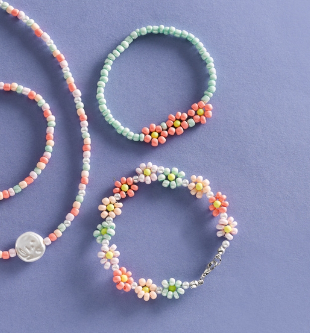Süßen Perlenschmuck ganz einfach selbst machen! Mit diesem Set kannst du ohne Vorwissen sofort losfädeln und deinen eigenen Schmuck designen. Die süßen Blümchen werden das Highlight bei deinem nächsten Outfit. Also ran an die Perlen und los!