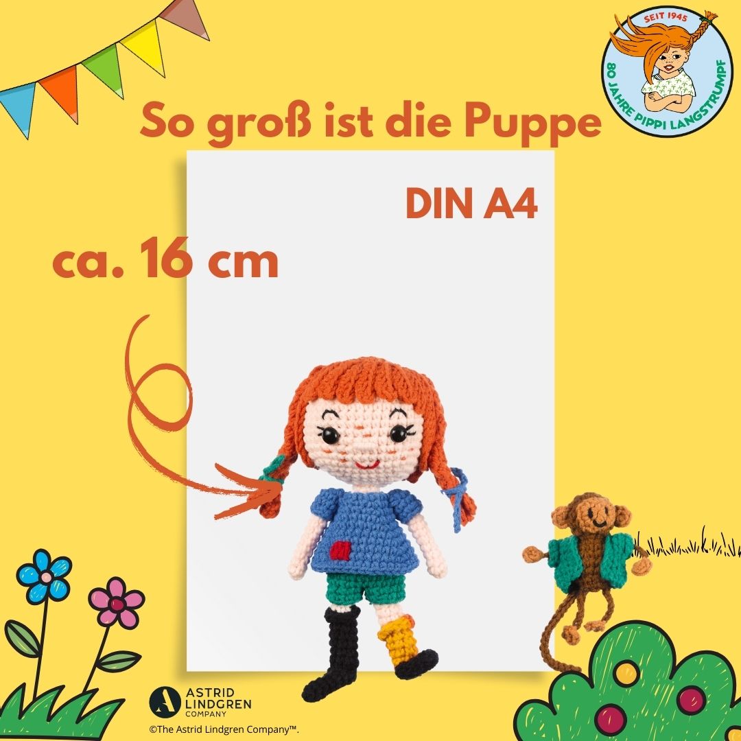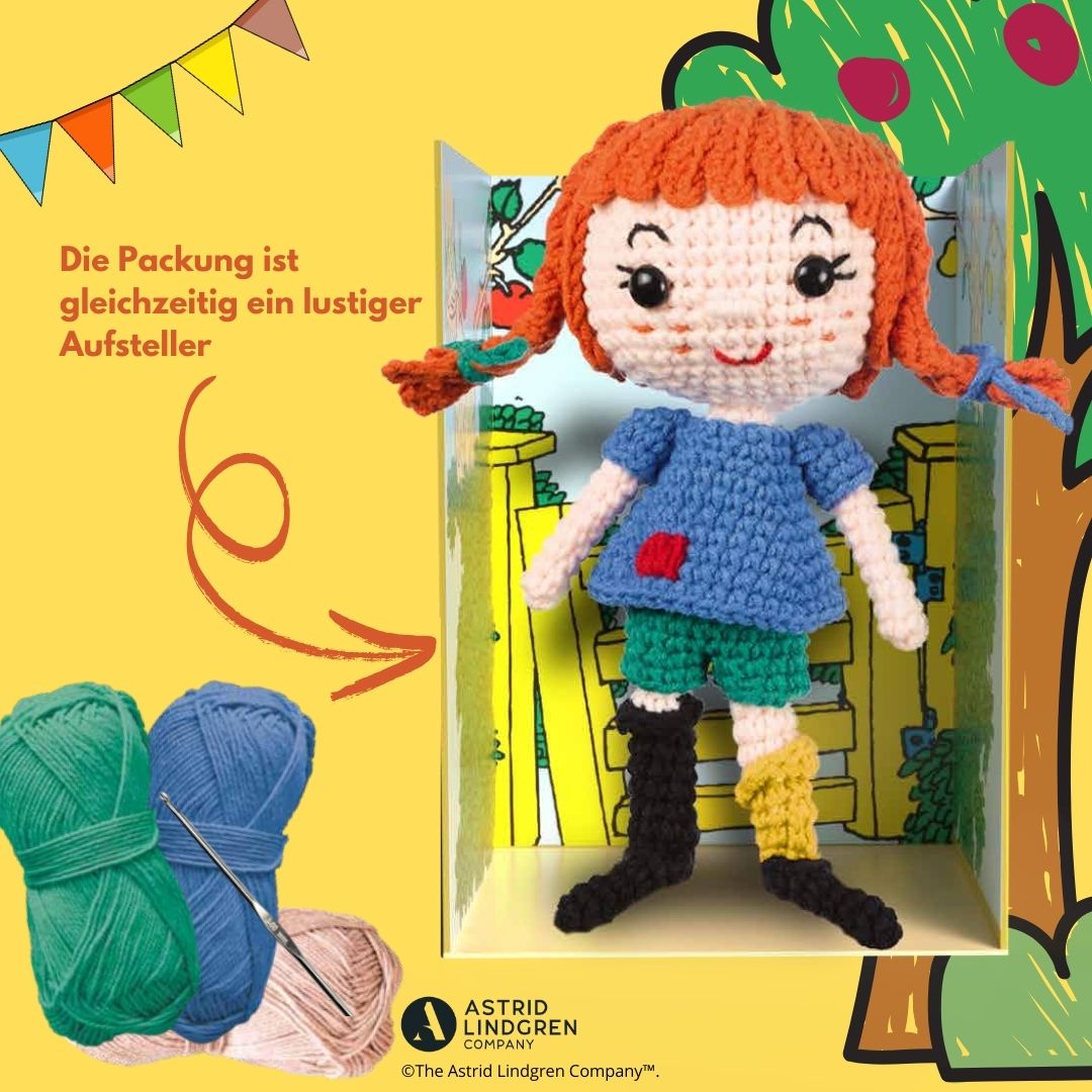 Passend zu diesem Jubiläum kannst du dir deine eigene Pippi-Figur mit dem lustigen Affen Herrn Nilsson häkeln. Dieses Set beinhaltet alles, was du dafür brauchst: Garn, Füllwatte, Häkelnadel, Sicherheitsaugen und einen Aufsteller, auf dem du Pippi und Herr Nilsson in Szene setzen kannst.