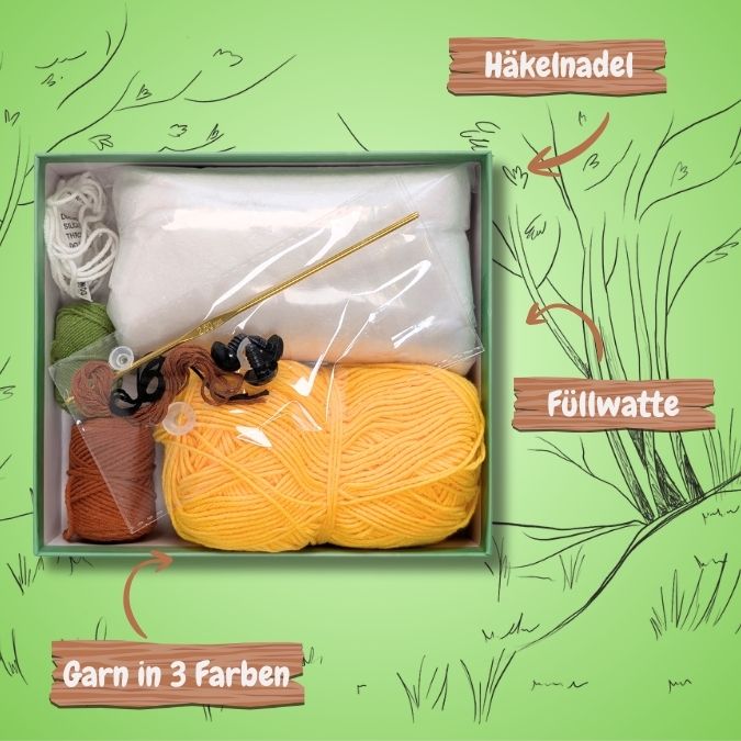 Anleitung mit Fotos und Videos, Misch-Garn, Häkelnadel, Füllwatte, Karten mit Zitaten