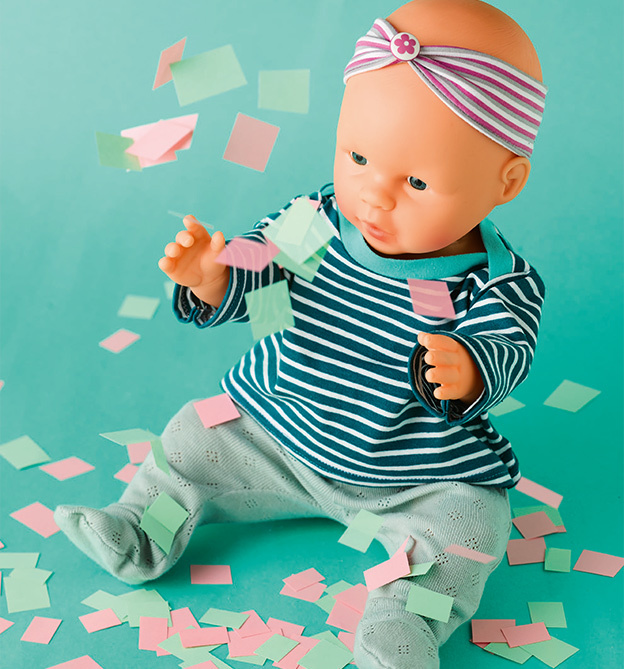 Bei den im Buch abgebildeten Puppen handelt es sich um „Krümel“ von Jako-o (43 cm, trägt Größe S), die „New Born Baby “ von Simba (43 cm, ebenfalls Größe S), die „Hello Baby“ von Bayer Design (46 cm, Größe M) sowie die „First Words Baby“ von Bayer Design (33 cm, Größe XS). Natürlich passen die Puppenkleider aber auch den meist en Puppen anderer Hersteller, die im Handel angeboten werden. Die Informationen hierzu finden Sie unter „Größe finden“ auf der vorderen Klappe des Buches." (Ina Andresen)