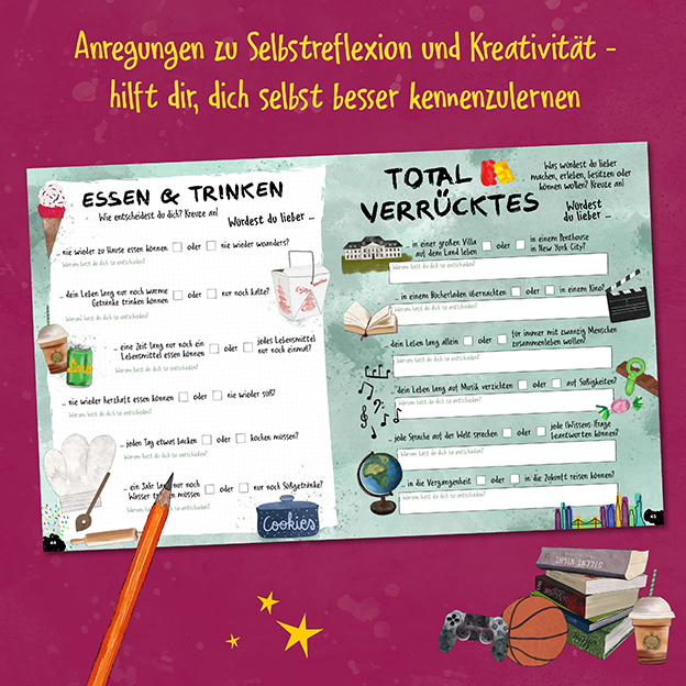 - Anregungen zu Selbstreflexion und Kreativität – hilft dir, dich selbst besser kennenzulernen
