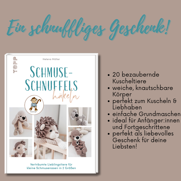 Jedes Schnuffeltier hat einen weichen Körper, der sich wunderbar anfühlt und beim Schlafen oder Kuscheln perfekt knautschen und knuffen lässt. Mit einfachen Grundmaschen und klaren Anleitungen kannst du im Handumdrehen ein neues Lieblings-Kuscheltier für kleine und große Schmusenasen zaubern. Vom süßen Hasen über den niedlichen Löwen bis hin zum herzallerliebsten Otter ist für jeden etwas dabei. Egal, ob für kleine Kinderhände, als Geschenk zur Geburt oder einfach als liebevolle Überraschung – diese Kuscheltiere sind das perfekte Geschenk, das von Herzen kommt.