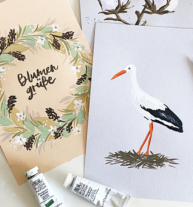 Gouache lernen in 30 Minuten pro Lektion und Blumen-, Blätter- und Tiermotive malen