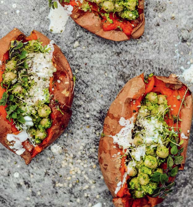 - Vegane Rezepte: "Rührei" aus Tofu und Sojajoghurt, fluffige Apfelpancakes, gefüllte Süßkartoffeln mit Grünkohlpesto und Kichererbsen, Brownies