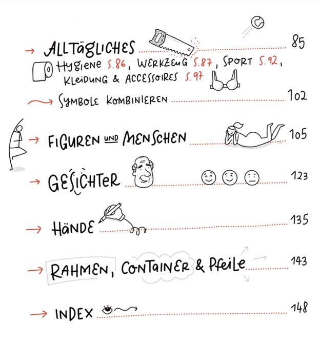 In dieser großen Sketchnotes-Bibliothek der Bild-Vokabeln und Symbole findest du für alle "Mist, wie visualisiere ich das denn?!"-Momente das richtige Bild. Über 1.000 Symbole, Zeichen, Buchstaben kannst du ganz einfach nacharbeiten. Viele Motive werden Schritt für Schritt gezeichnet – so klappt's garantiert!