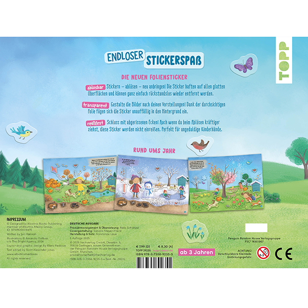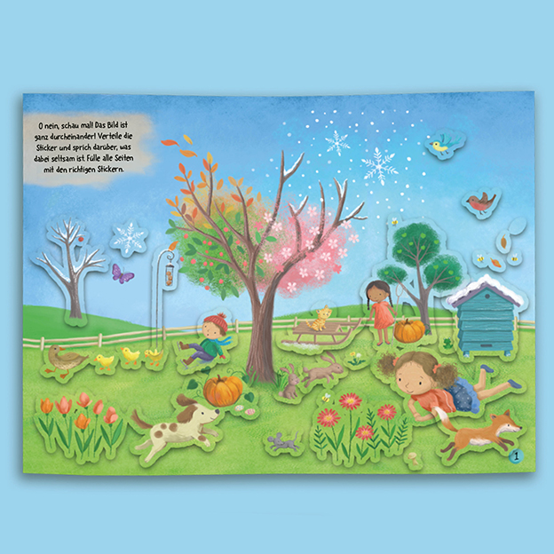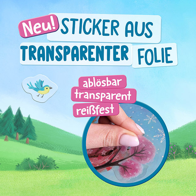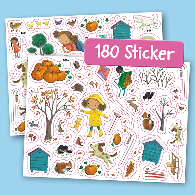 Frühling, Sommer, Herbst und Winter – Entdecke, wie sich die Natur im Laufe eines Jahres verändert! Mit über 180 fantastischen Folienstickern kannst du die Bilder ganz nach deinen Wünschen gestalten. Und das Beste ist, dass du die Sticker auch wieder ablösen und an anderer Stelle platzieren kannst. Du kannst also immer wieder neu dekorieren und deine Lieblingsszenen erschaffen. Kleiner Tipp: Die Sticker haften auf allen glatten Oberflächen, also zum Beispiel auch auf Fenstern!