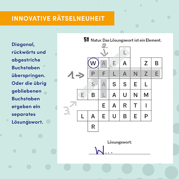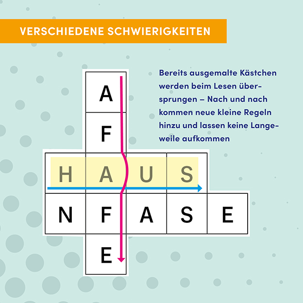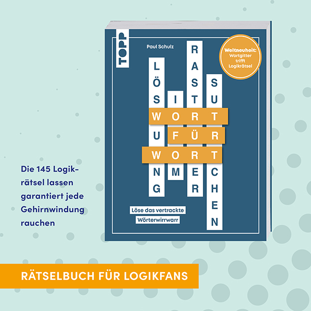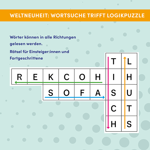Weltneuheit: Wortsuche trifft Logikpuzzle. Buchstabengitter in ansteigender Schwierigkeit – kannst du alle knacken?