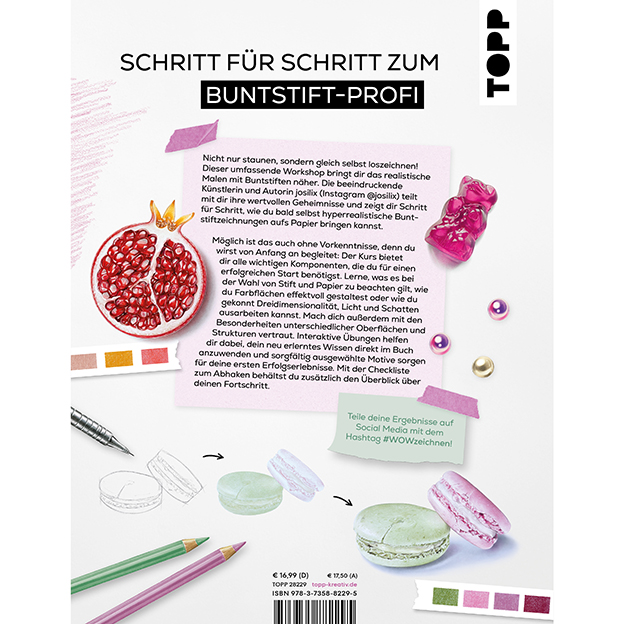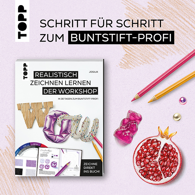 Nicht nur staunen, sondern gleich selbst loszeichnen! Dieser umfassende und gründlich durchdachte Workshop macht dich in kurzer Zeit zum Buntstift-Profi. Die beeindruckende Künstlerin und Autorin josilix (Instagram @josilix) teilt mit dir ihre wertvollen Geheimnisse und zeigt dir Schritt für Schritt, wie du bald selbst hyperrealistische Buntstiftzeichnungen aufs Papier bringen kannst.