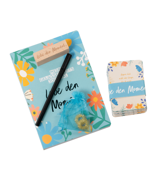 Box mit 50 Gelassenheits-Karten mit verschiedenen Impulsen & Übungen, Kartenhalter, Journal, Brush Pen und zwei Akupressur-Fingermassageringen